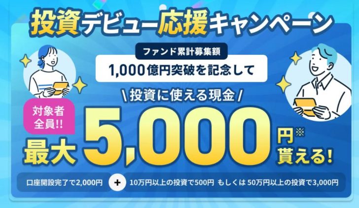 ・特典:現金2,000円(10万円以上の投資で500円、50万円以上の投資で3,000円を追加でプレゼント)